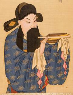 图是清宫戏画《泗州城》中的知州,是五品官,所以身穿地位较低的蓝色官衣。