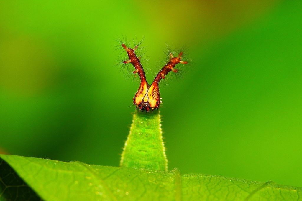 夏季的清晨,摄影师漫步在灌丛中,在一片朴树树叶的背后发现了这个探头探脑的小家伙。这是一条猫蛱蝶的末龄幼虫,它正准备大快朵颐享用这片朴树叶,被摄影师惊扰后,立起了前半身好奇的顶着眼前的镜头。头壳上,带着刚毛的角像是小兔子的耳朵,看起来萌萌的。