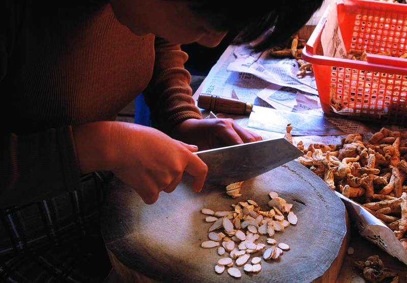 人参制品食用方便、耐贮存,很好地保持了鲜参的营养价值和药用价值,大受欢迎。虽然中国的人参出口量是韩国的30倍,但出口创汇率只有韩国的1/10。缺少知名品牌和农药残留量超标都是中国人参价低的重要原因。图为人工切制人参干片。