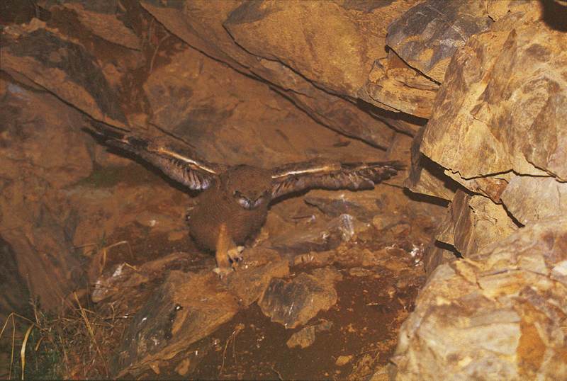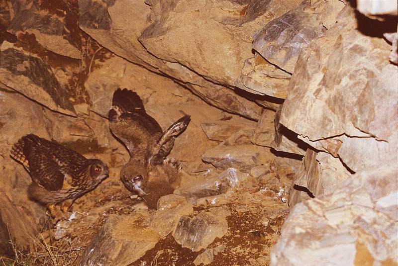 这张照片是作者从雕枭筑巢的断崖上俯拍的。军民村只有三四十户人家,群山环抱,几乎没有现代化工厂,很适合雕枭生活。由于雕枭是夜行猛禽,想在白天发现其行踪并跟踪到巢穴,还是相当费力气。