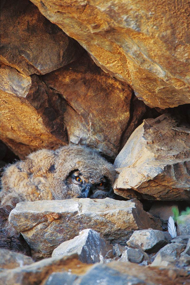 虽是夜行猛禽,当阳光照进巢穴中时,小雕枭做出的并非是诸如不敢睁眼等的畏光反应。它舒服地枕在石头上,惹人怜爱的模样不逊于人类喜爱的幼猫幼狗。