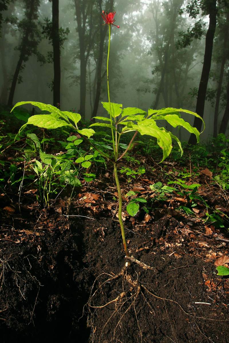 在浓阴的遮蔽下,这株沐浴着长白山雨露的林下参颇有几分神秘的气息。林下参与野生人参一样生长在自然环境中,几乎没有人工干预,生长速度与野山参一样缓慢。成品上市后,同样价格不菲。