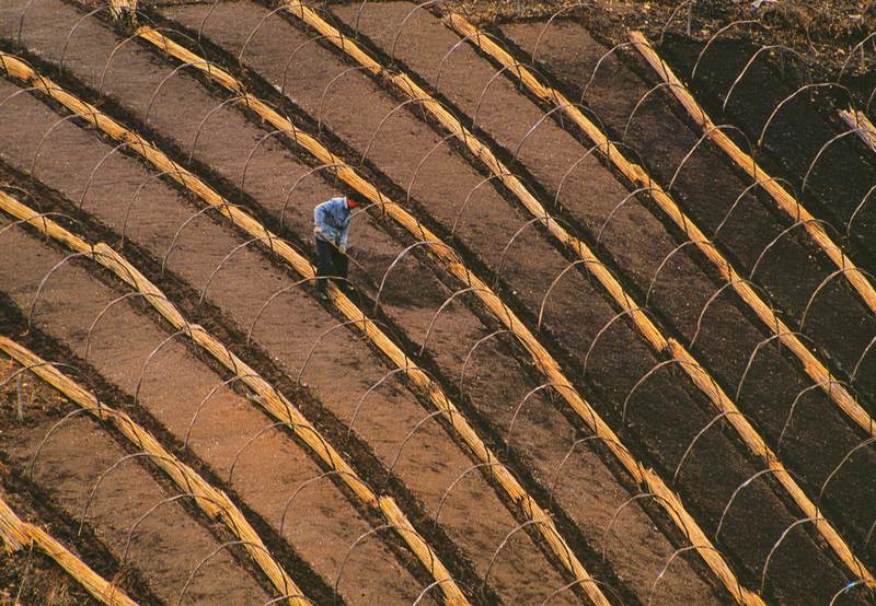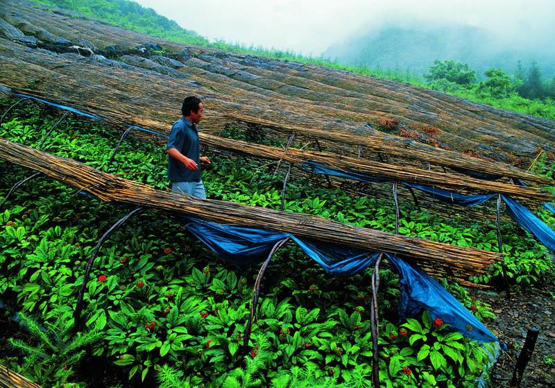 这张照片拍摄于春季的长白山脚下,参农正在平整人参种植园的土地。并不是哪里的土地都可以种植人参,参地的营养成分很高,而且要清凉湿润,也就是说人参大多是种植在林地砍伐以后开垦出来的处女地上。