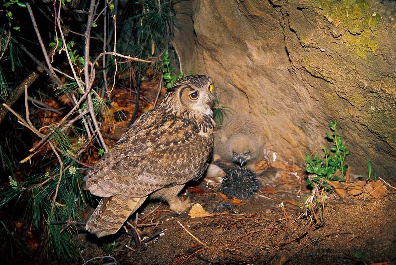雕枭的食物以老鼠为主,不过有时候它们也会换换口味——这只刺猬就是雕枭为孩子们准备的别样大餐。有时它们甚至吃野鸭。