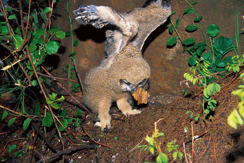 5月3日夜,成年雕枭最后一次为小雕枭送来食物。图为小雕枭刚接过老鼠,正准备大快朵颐。5月4日凌晨,这两只翅膀已经发育好的强壮的小雕枭就双双告别了巢穴,一起飞入春意萌发的森林。