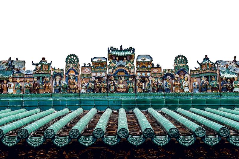 俯仰“混搭”的瓦 广东佛山简村的圣堂古庙,又名北帝庙,祭祀主管水利的真武帝君。此庙始建于南宋,后经历次重修,图中的屋瓦部分,底瓦用普通的板瓦,盖瓦、瓦当和滴水则采用了绿色的琉璃瓦,“混搭”特色鲜明。屋脊上的塑像生动逼真、热闹拥挤,具有浓郁的地方风格。 摄影/刘晶
