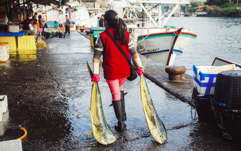 一个妇女拖着两条刚刚捕获的大鱼兴匆匆地赶往市场。