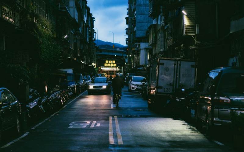 夜幕降临,小镇上亮起了街灯,时来也会有穿梭的车辆经过。