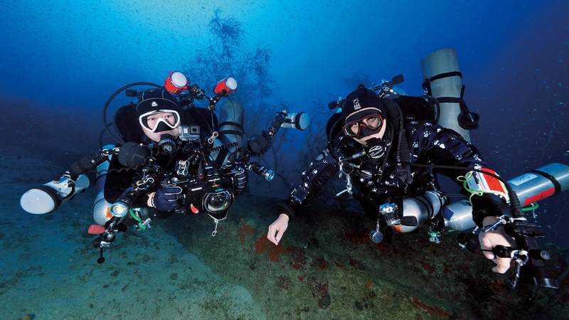 图为张帆及其潜伴李堃在阿肯色号战列舰的尾部。摄影/刘毅