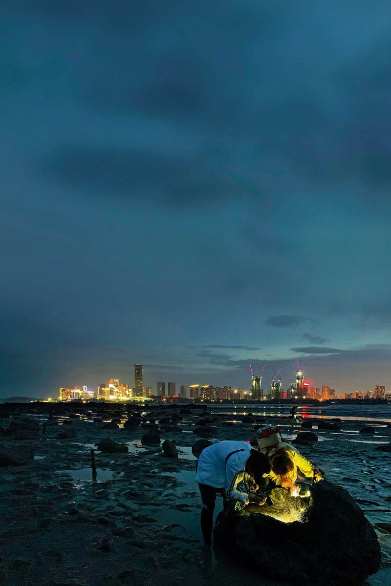 夜幕降临,映衬着远处城市的灯火,本文作者刘毅和同事在厦门市周边的潮间带进行底栖生物调查。为了躲避白天强烈的紫外线,很多底栖生物都选择在夜间活动,调查人员在潮间带发现一块礁石顶部深深凹陷下去,形成了一个袖珍的潮池。摄影/刘毅