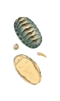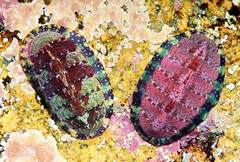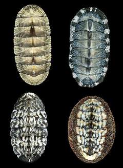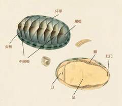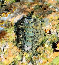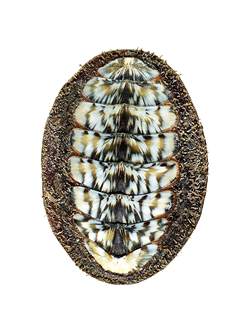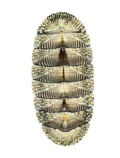 石鳖属于多板纲,在软体动物里是很原始的。软体动物的祖先是没有壳的,后来在背上长出了简单的壳。然后壳越来越复杂,有的打着卷长,变成了螺;有的长成两片,变成了蛤蜊。