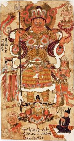 敦煌发现的毗沙门天王像(10世纪前后),右侧身披狮子皮的就是二郎“独健”。