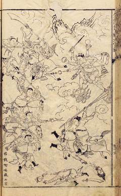 杨戬与哪吒这对“失散多年的亲兄弟”,在古典小说里就常常并肩作战。图为明代《封神演义》插图“杨戩哪吒收七怪”,右下手持三尖刀、头戴三山冠的清秀郎君即杨戬——明代流行的二郎神形象,一般都没有第三只眼。