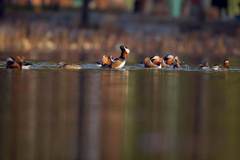 很快,就有三五只陆续结伴飞至。半个小时后,湖面已聚集有二百多只鸳鸯,它们一入水就开始大跳热舞。