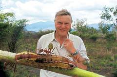 在南非拍摄《哺乳类全传》时,一只细尾獴(猫鼬)正好跳上爱登堡的肩头。