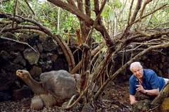 爱登堡讲解“孤独的乔治”——平塔岛象龟(加拉帕戈斯象龟亚种之一)的最后一个个体,它从1971 年被发现直到2012年死去,一直孤独终老,它的死也意味着这个亚种灭绝。