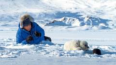 拍摄《冰冻星球》时,时年84 岁的爱登堡,在竖琴海豹幼崽栖息的北极浮冰上出镜。