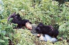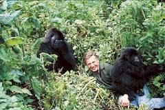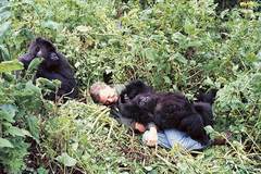 在中非地区的维龙加国家公园,爱登堡出镜讲解山地大猩猩时,遇到两只已经习惯与人类接触的年轻大猩猩。