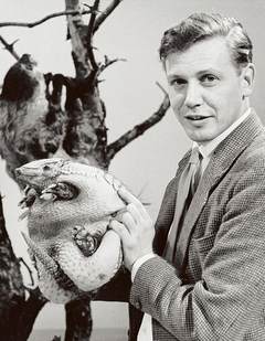 年轻时的大卫·爱登堡,在《动物园探奇》中讲解六带犰狳(前)和二趾树懒( 后)。