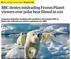 《 冰冻星球》中北极熊产仔镜头饱受争议。图为英国《卫报》报道BBC 做假事件。