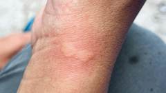 被扎后的手腕肿起大包,能看出黄刺蛾蜇伤典型的马鞍形轮廓。