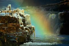 因近日气温骤降又稍有回升的缘故,黄河壶口瀑布出现绮丽的冬日彩虹,蔚然壮观。