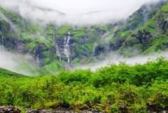 夏季的四姑娘山可谓是生如夏花,灿烂无比,山花遍野、溪流清澈,潺潺流水冲刷着历经尘世的心。这里冰川环绕,森林繁茂,地势险峻,刃脊背负雪山……